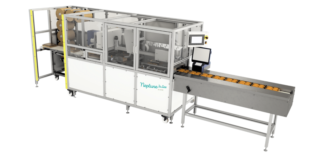Packing machines Depending on your requirements, our semi-automatic or fully automatic packaging machines enable you to package, label, and seal a wide range of BVP products. Our FLOW BAGGER technology offers an innovative alternative to traditional flow pack machines. The concept: the machine continuously produces custom-sized bags from a tubular film supplied on a reel.It unwinds the film, cuts it to the desired length, then folds and seals one end to form the bag. The product is then inserted—either manually or automatically—into the bag, which is kept open by an air NEW: NEPTUNE IN-LINE WHAT IF YOUR MACHINE FINALLY ADAPTED TO YOUR PRODUCTION! With Neptune In-Line, DUNE takes a new step forward in the industrialization of its packaging solutions with a key innovation: IN-LINE OUTPUT Designed to integrate directly into the production flow, Neptune In-Line enables seamless integration with existing equipment. – Reduces handling time for your teams and optimizes your production – Fast and simplified format change in just one minute – Possibility of integrating upstream or downstream equipment with the machine, such as a labelling system, a metal detector, etc. – Adaptive system compatible with all production configurations RESULT: Smooth, continuous, and adaptable production.You gain industrial agility. Download the brochure NEPTUNE IN-LINE JUPITER JUPITER is a fully automatic packaging solution. The perfect combination of productivity, format flexibility and ease of integration. Can reach 1200 cycles/hour. Packages and labels all types of bakery products.Easily adapts to different formats and types of products.Mobile and Compact. Download the brochure JUPITER - CÉRÈS - Our CÉRÈS semi-automatic machine packs and label : Pastries, snacks, biscuits up to 600 cycles/hour. Breads and batches of 3+1. Play Video Download the brochure CÉRÈS CÉRÈS Mini A MINI machine for a MAXI impact that automates the packaging and labeling of your pastries. Up to 450 cycles/h.Quick format changeover. The 100% pastries solution. Download the brochure CÉRÈS Mini - D60 - With our D60 automatic machine, pack and label :Baguettes and specialty breads.Up to 2400 cycles/hour. Play Video Download the brochure D60 D30XL With our semi-automatic D30XL machine, pack and label : Baguettes, specialty breads and batches of 3+1. Up to 1800 cycles/hour. Play Video Download the brochure D30XL